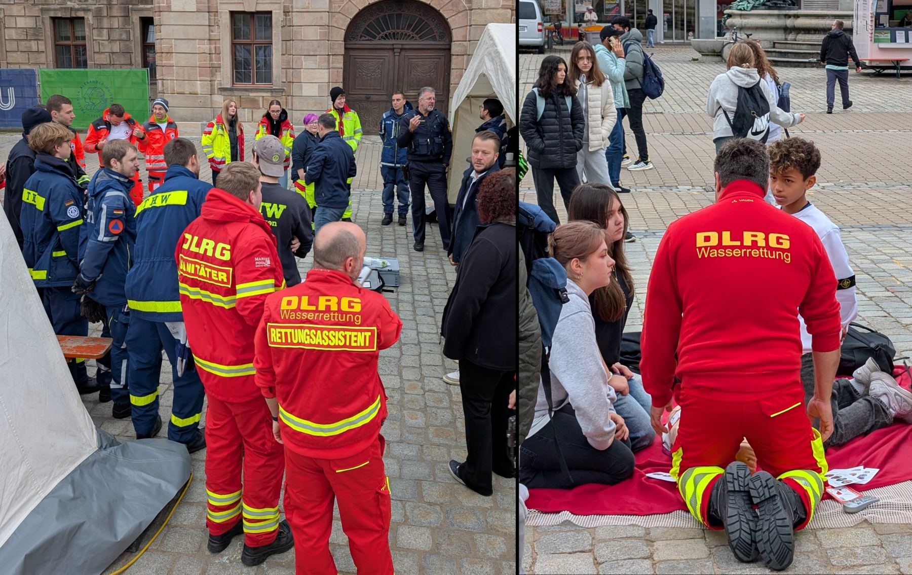 Ziel ist es, weltweit so viele Menschen wie möglich in Wiederbelebungsmaßnahmen zu schulen. Deshalb waren heute Mitarbeiter des Uniklinikum Erlangen, des BRK Erlangen-Höchstadt, des ASB Erlangen-Höchstadt, des THW Ortsverband Erlangen, der DLRG Erlangen, der DLRG Dechsendorf und der Polizei Mittelfranken am Erlanger Schlossplatz gemeinsam präsent, um mit interessierten Bürger*innen die Reanimation an Erwachsenen, Kindern und Säuglingen zu üben. Auch etliche Schulklassen hatten sich angemeldet, so war dauert was los.